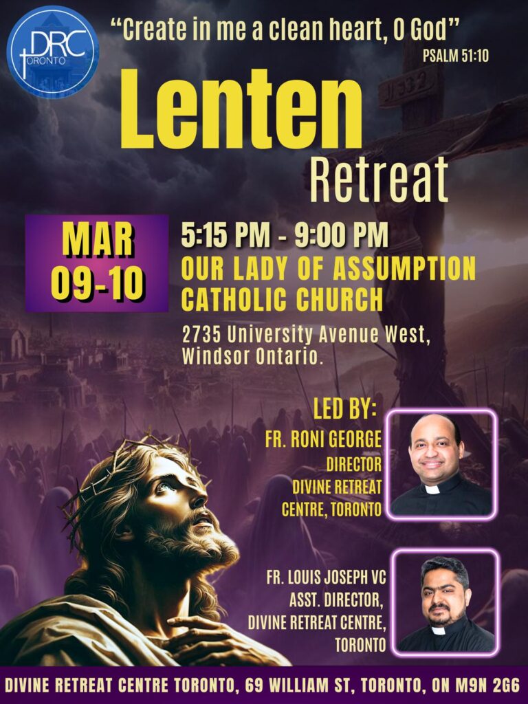 Categories: Events Event: 2026 Lenten Retreat Date: March 9th, 2026 Time: 5:00pm Location: Assumption Church