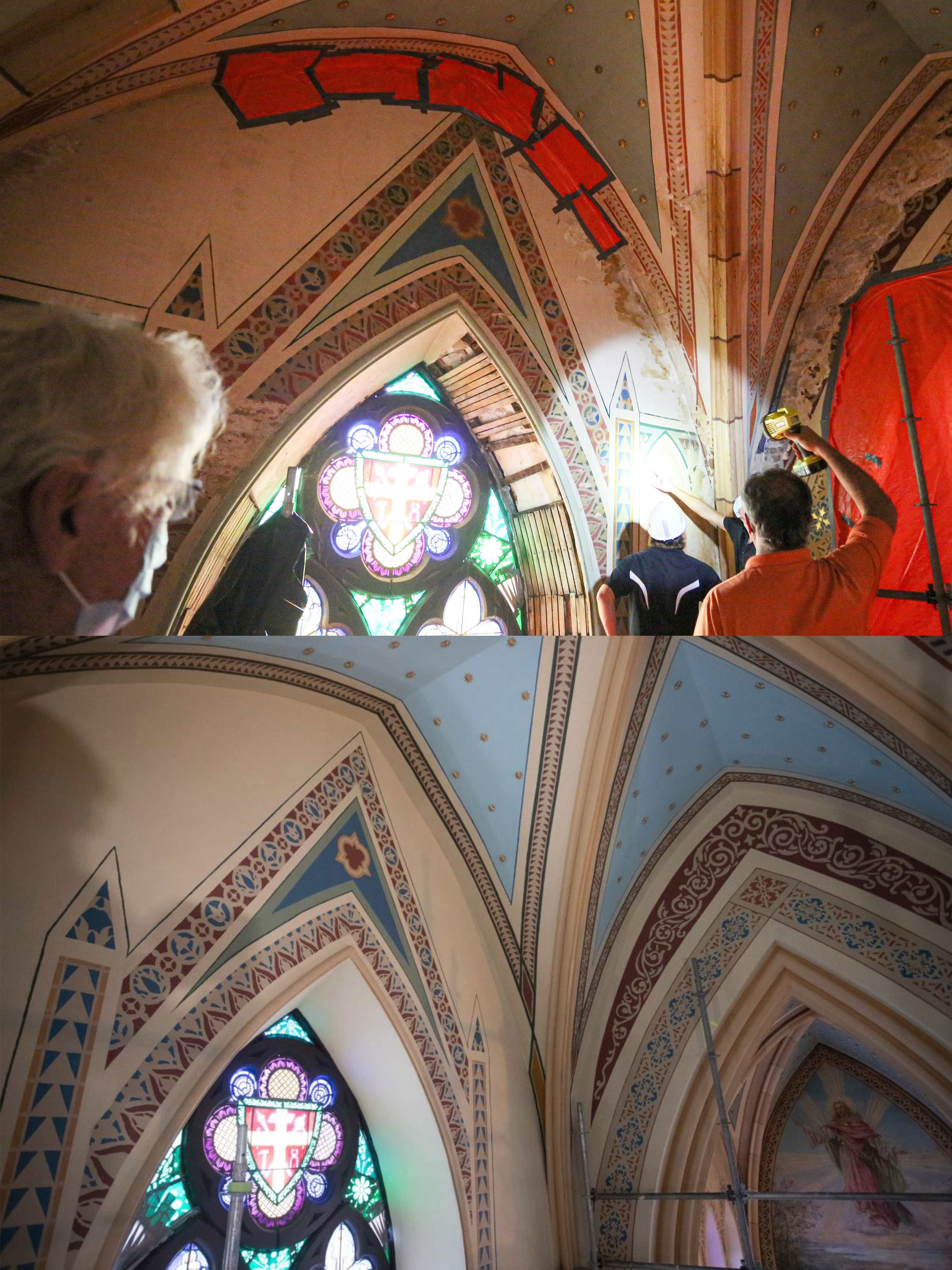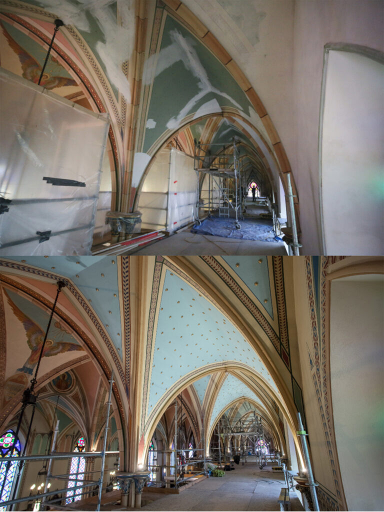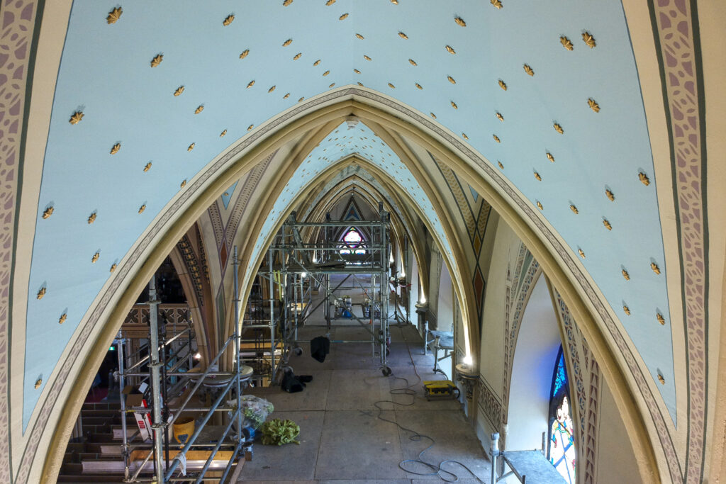 Restoration work is wrapping up on the first three bays of the East wall at Assumption Church.