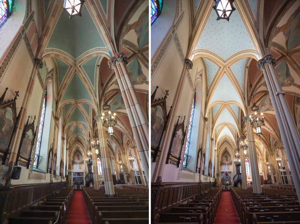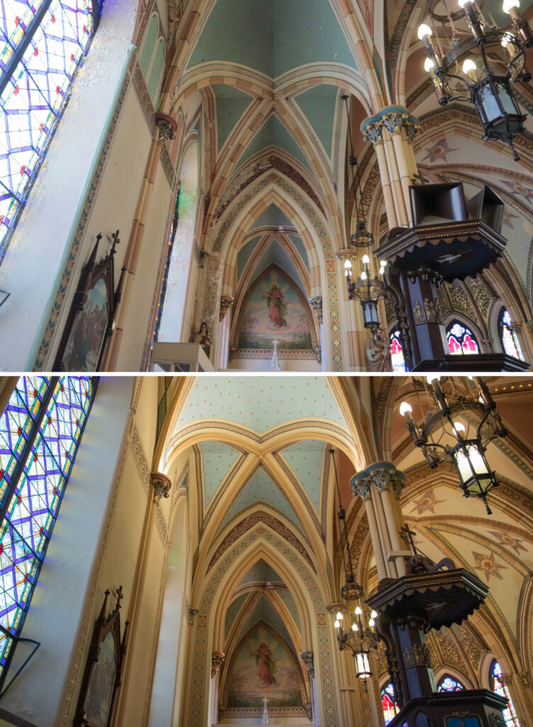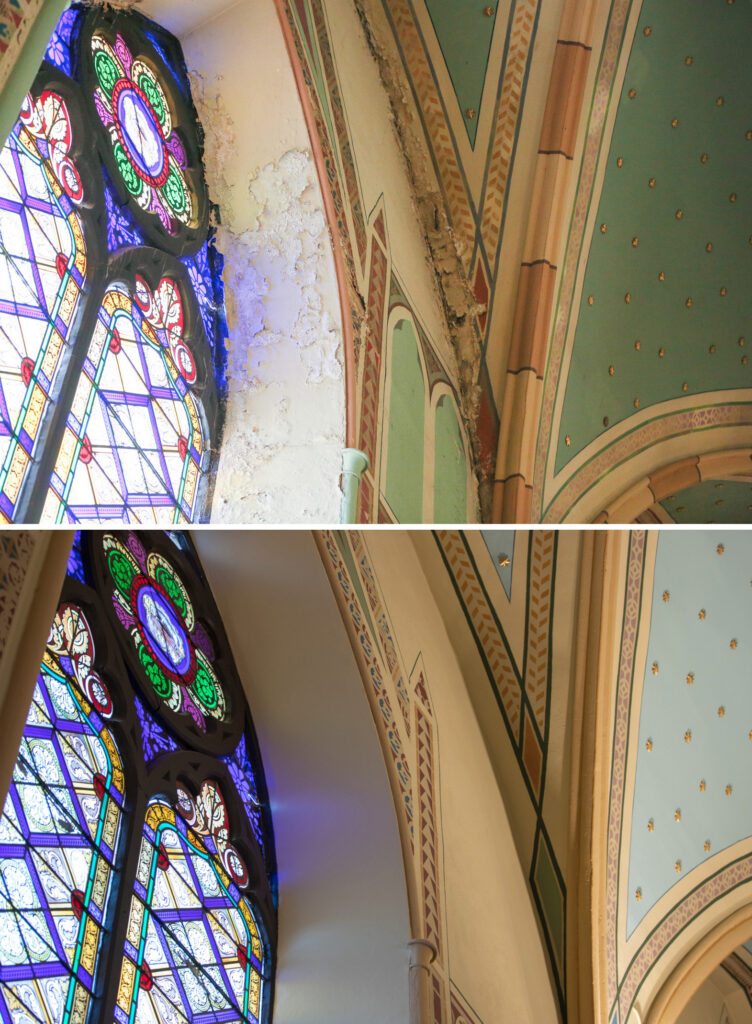 Restoration work is finished on the the East wall at Assumption Church. Here are photos of the before and after showing the area now that the scaffolding has come down.