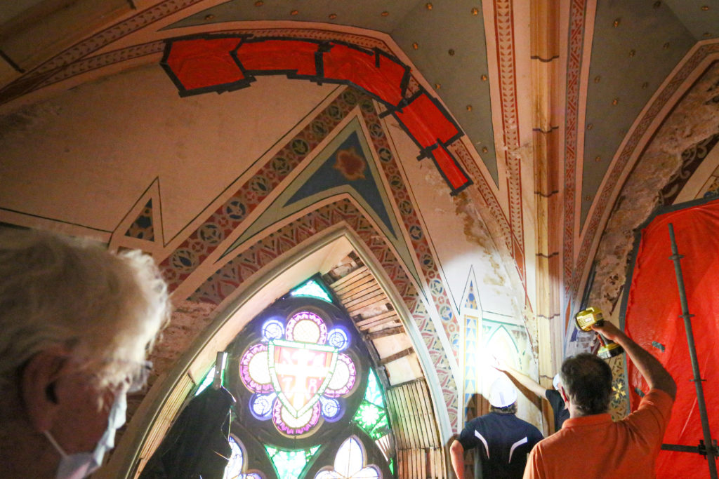 A look at one of the church’s stained glass windows where areas of plaster that suffered water damage has been removed.