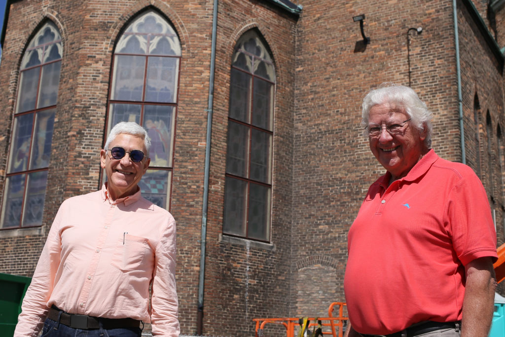 Paul Mullins poses for a photo on a temporary work platform installed on the roof of the church.