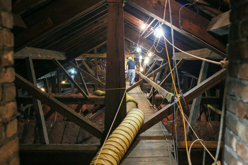 A worker removing debris from inside one of the ceiling’s groin vaults (bottom).