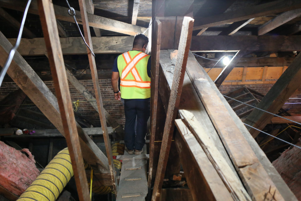 Construction manager Tony Pupatello Jr. examines the worksite using a catwalk to reach the side aisles.