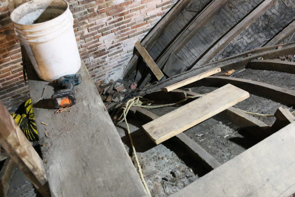 Debris including brick fragments, dust, insulation and miscellanous items has accumulated in the ceilings lower areas (groin vaults). Workers will be removing this debris prior to the start of plaster consolidation.