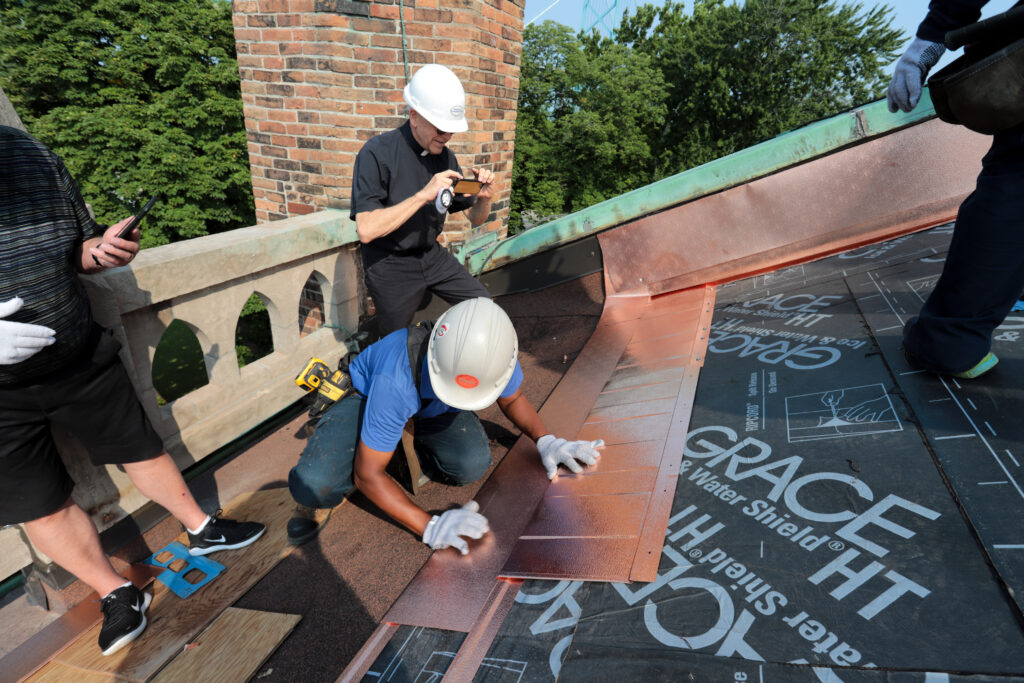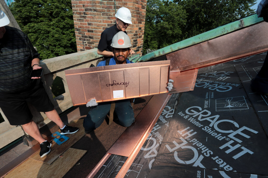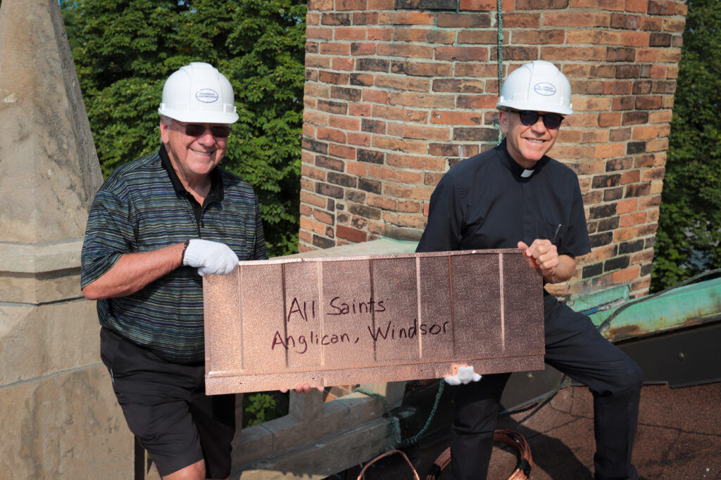 The first copper shingles have gone up on the roof of Assumption Church today! Fr. Maurice and Paul Mullins held a ceremony to place the first shingle, graciously donated by our Christian friends at All Saints Anglican Church.