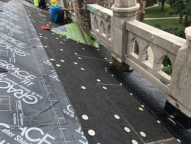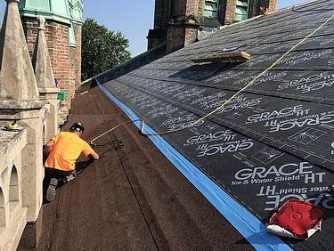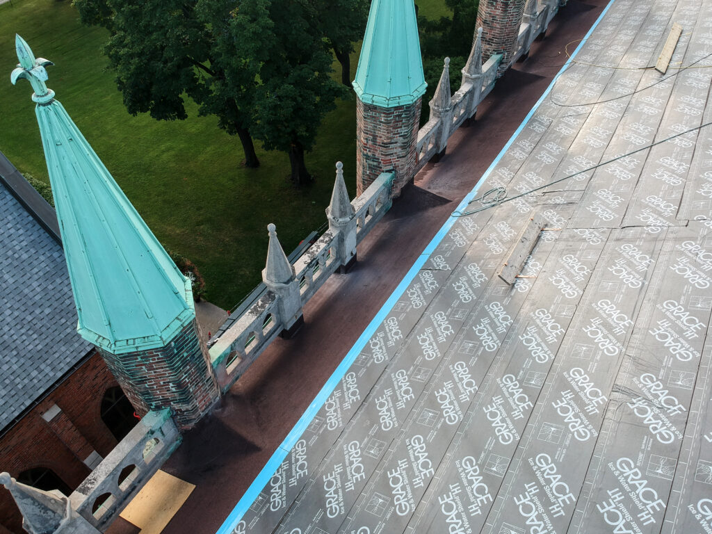 Double AA Roofing’s subcontractor Empire Roofing is completing the highly detailed installation of the 2-ply roof apron on the west side of the church’s roof. This is an area where copper shingles will not be installed until a later date as the area will need to be worked on when the church’s masonry is replaced in a later phase.
