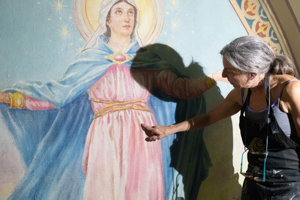 Award winning artist Lori Le Mare and her partner Gord Pullam who are the restoration are the restoration artists who are cleaning and resorting the beautiful paintings and murals that adorn Assumption Church.
