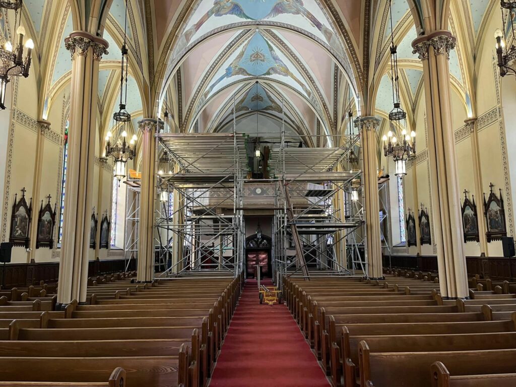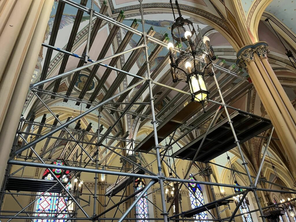 This week construction crews have been removing the scaffolding from the completed centre section of the church.