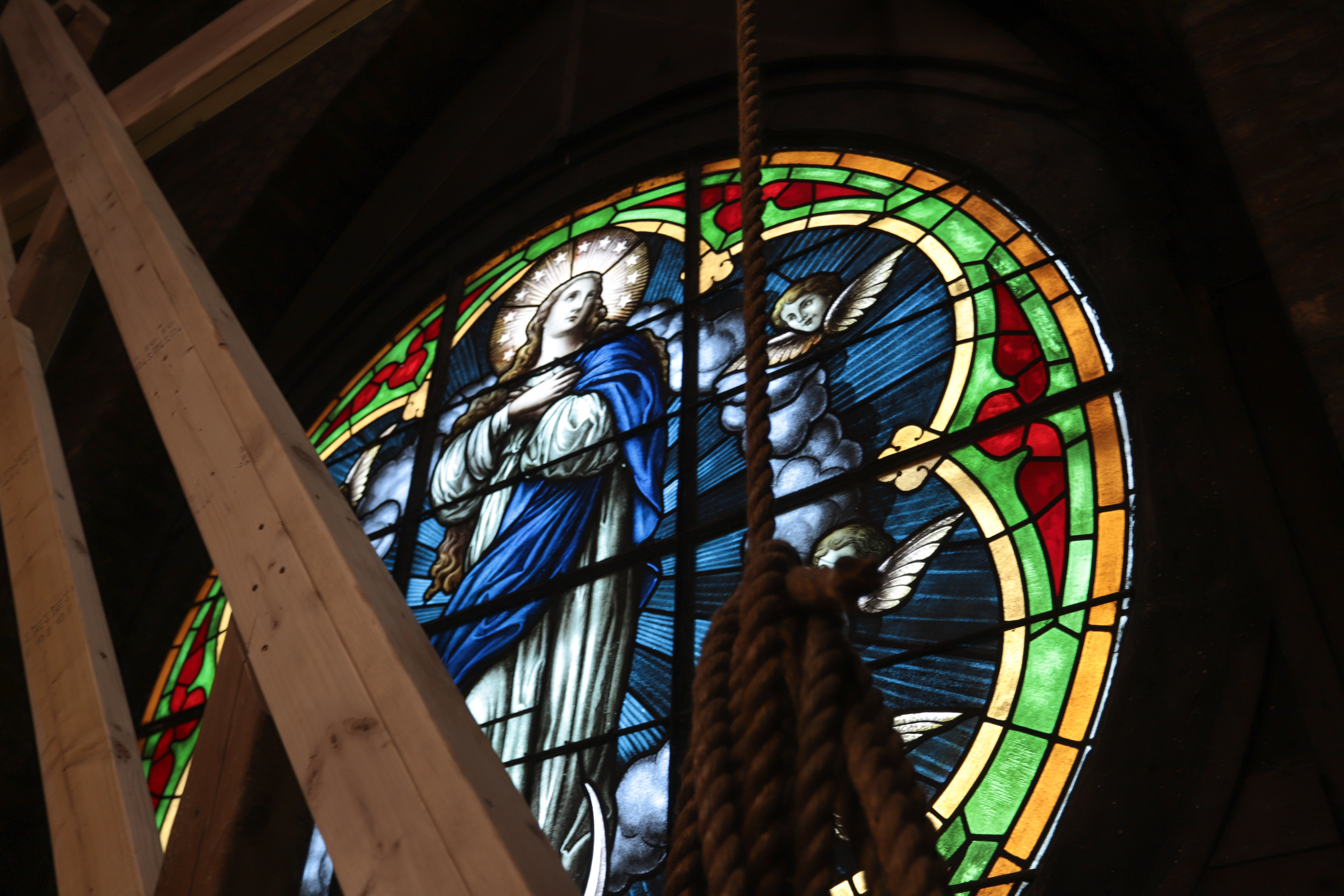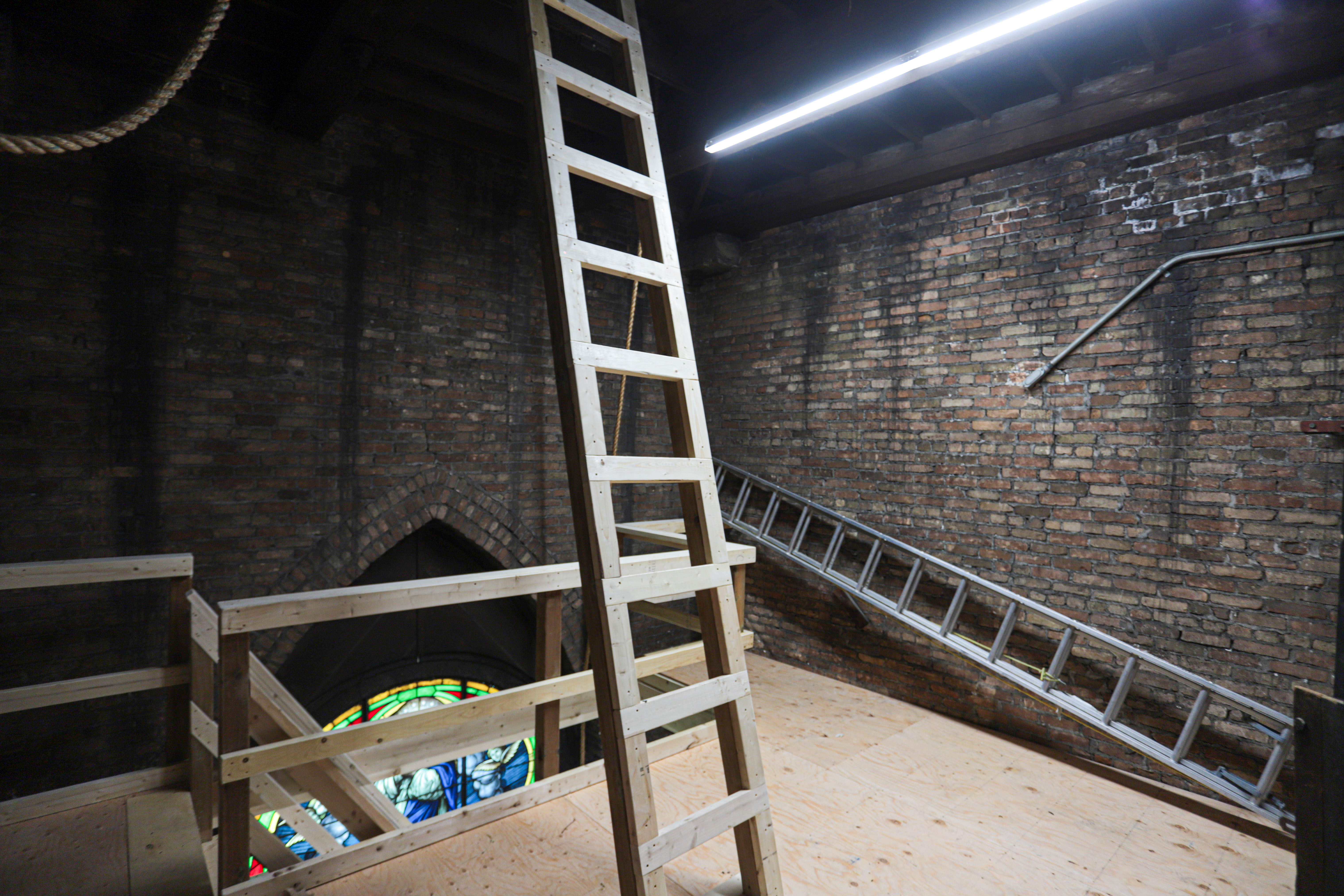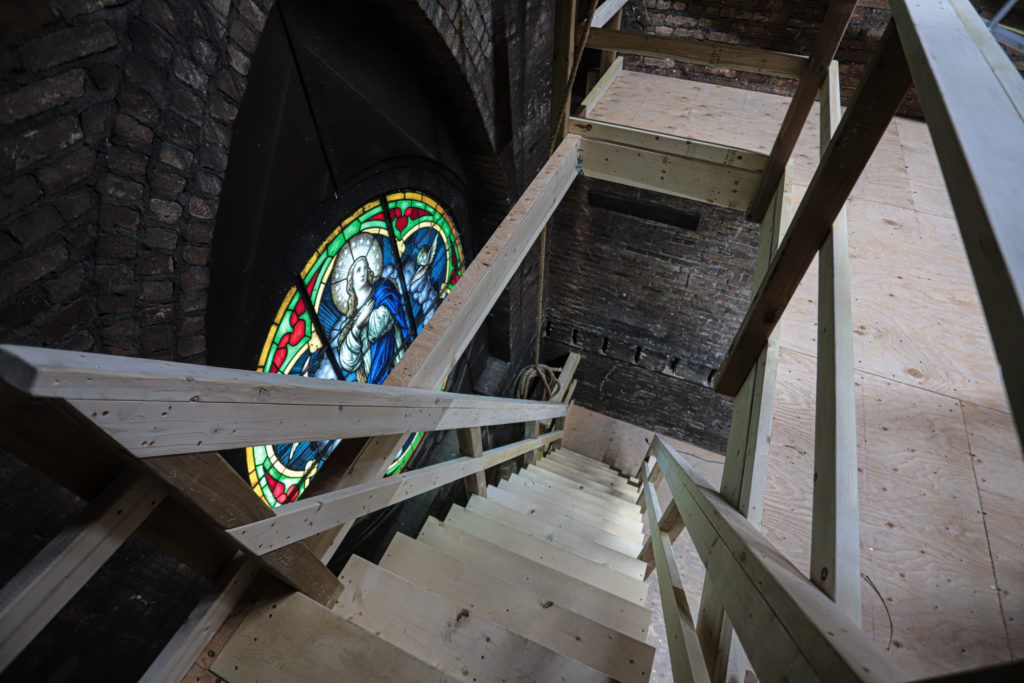 This new tower replaces a series of ladders and will make it easy and safe for contractors to access the attic area above the church for phase two construction.